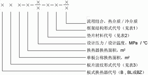 注:1、框架結構形式為 Ⅰ 時,框架結構形式可省略。 2、B-板式換熱器代號;BL-板式冷凝器代號;BZ-板式蒸發器代號。 3、流程組合都為單時可省略。 |